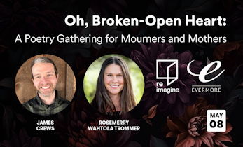 Join us for this intimate, whole-heart-affirming program, led by James Crews (who lost his mother) and Rosemerry Wahtola Trommer (who lost her son), which begins with the poets sharing poems and speaking openly about how writing has helped them meet grief. Then they will offer invitations for participants to do their own writing, followed by a conversation about what rises up when we turn toward our loss and write into our heartache.